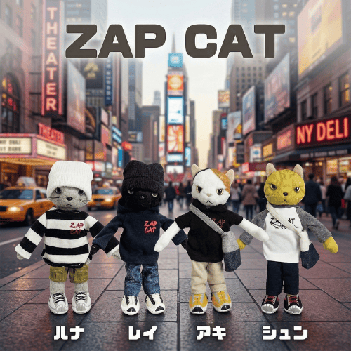 ZAP CATは、株式会社 内藤デザイン研究所が手がけるおしゃれ猫ぬいぐるみシリーズですにゃ。1979年設立の老舗メーカーで、「かわいらしい」を追求し続けて50年以上の実力派ですにゃ。
